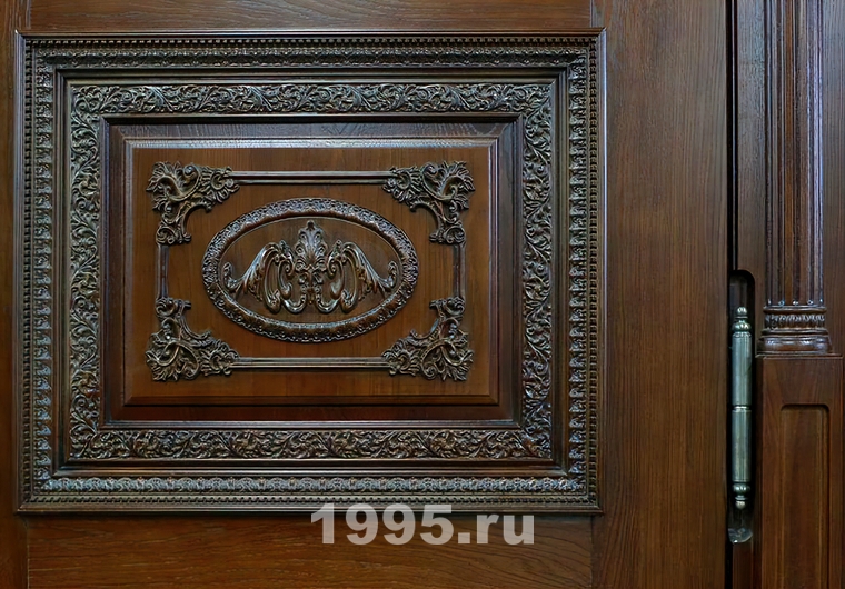 Стальная дверь с массивом дуба, резьбой и карнизом
