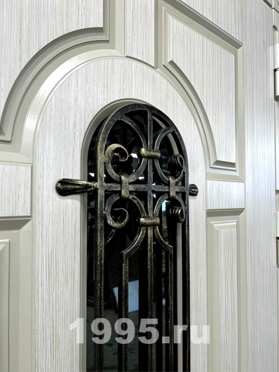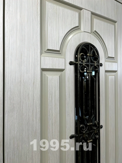 Полуторная термодверь с ажурной фрезеровкой, ковкой и стеклом