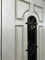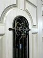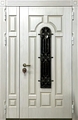 Двустворчатая дверь МДФ с карнизом, с остеклением и коваными решетками