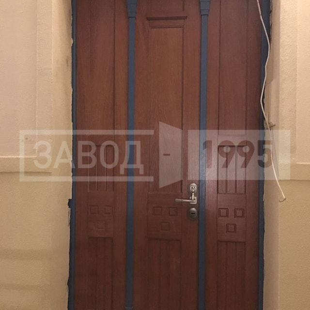 Новые парадные двери полностью имитируют фрезерованный рисунок оригинала, выдержаны в том же цвете. Наружная сторона также выполнена под дерево, фрезеровка оригинала выдержана в точности.